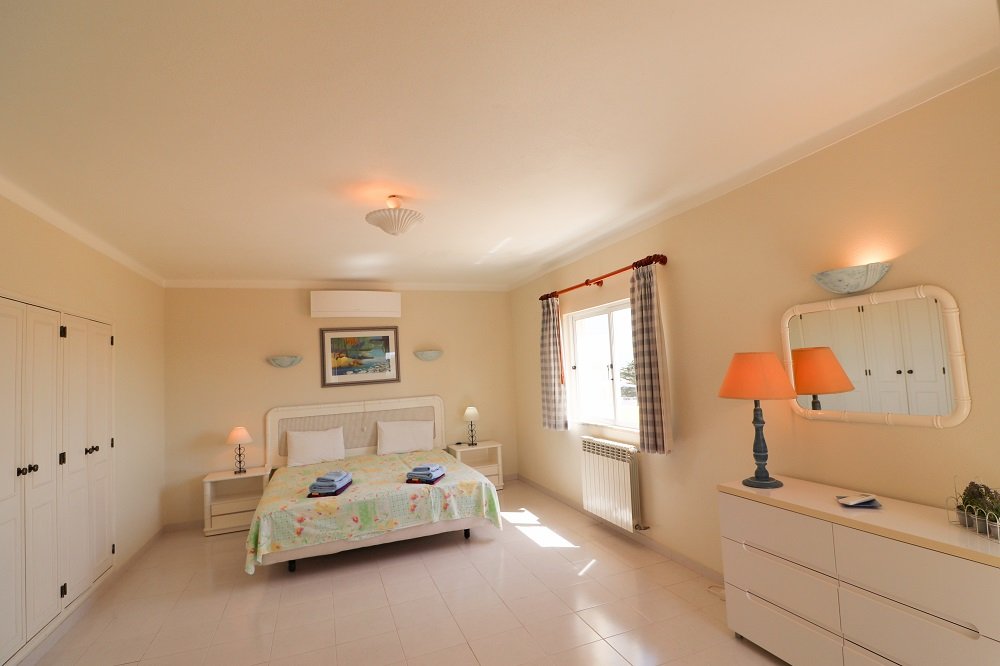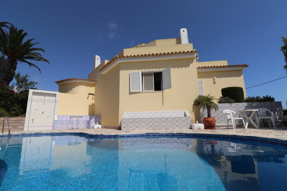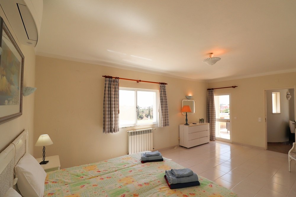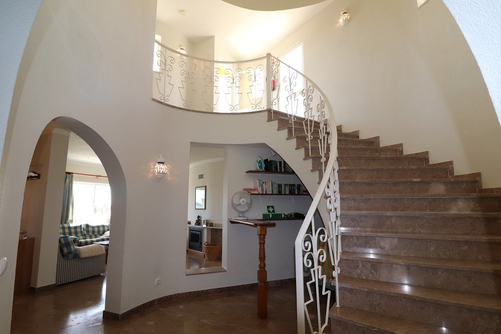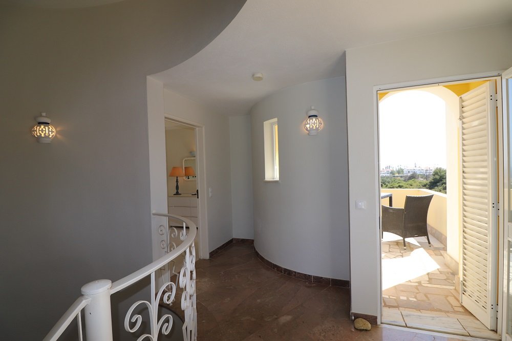 Diese großzügige Villa verfügt über 2 Etagen, einen großen Balkon mit Meerblick, einen schönen mediterranen Garten mit Pool, einen exzellenten Barbecue und vielen Möglichkeiten zum relaxen rund ums Haus. Die oberste Etage beherbergt ein großes Schlafzimmer mit Bad en suite und großem Balkon mit Meerblick! Im Erdgeschoß ist das Herzstück, das riesige Wohnzimmer (TV [&] Kamin) mit extra großem Esszimmer. 2 weitere Schlafzimmer und zwei Badezimmer befinden sich ebenfalls hier unten. Alle 3 Schlafzimmer sind mit Klima/Heizungsanlagen ausgerüstet. Die neue voll ausgestattete Küche und ein gemütlicher Patio (Innenhof) mit gemauertem Grill gleich dahinter sind einfach perfekt. Hier finden Sie eine gehobene und gepflegte Einrichtung vor, Granitboden im Erdgeschoß und eine riesige Wendeltreppe in die obere Etage. Zentralheizung für die kühlere Zeit in jedem Raum vorhanden, Waschmaschine und Geschirrspüler. Im Garten finden Sie idealerweise viele Sitz- und Relaxmöglichkeiten für Sonnen- und Schattenliebhaber. Die große Terrasse am Pool lädt zum sonnen und baden ein. Sie haben hier ein ungestörtes Domizil zwischen Strand und Golfplatz. Von dem Balkon genießen Sie einen sehr schönen Panoramablick auf den Atlantik im Süden. WLAN und Garage inklusive