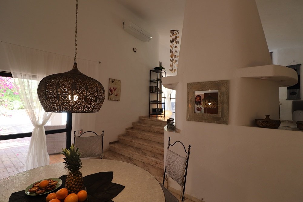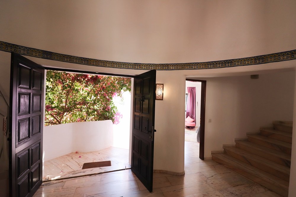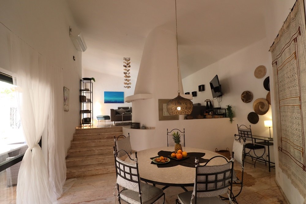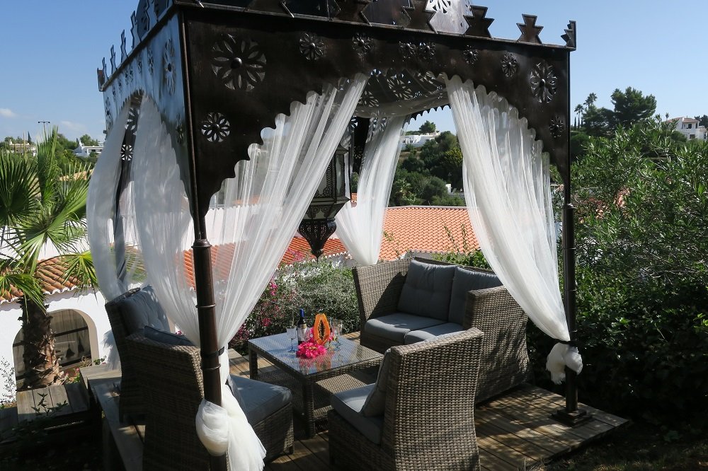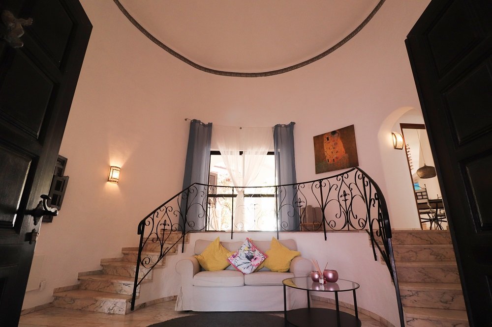 Die Villa la Perla wurde im landestypischen maurischen Stil erbaut und liebevoll renoviert. Daraus entstand diese einzigartige Ferien "Oase", sowohl modern als auch traditionell. Eingangs gibt es eine kuppelartige Halle mit Gäste-WC. Zur linken Seite liegen die drei klimatisierten Schlafzimmer, zwei Bäder mit großer begehbarer Regenwalddusche und die Badewanne für "zwei" zum Genießen. Alle Schlafzimmer haben Terrassenzugänge. 1 Schlafzimmer hat ein neues Boxspringbett Kingsize 01.2020. Zur rechten der Eingangshalle gibt es eine voll ausgestattete im Vintage Stil gehaltene Landhausküche. Gegenüber liegen das marokkanisch eingerichtete Esszimmer und das geräumige Wohnzimmer ein paar Stufen höher mit Kamin, SAT/Smart-TV, DVD und WLAN. Alle Zimmer verfügen über Klimaanlagen/Heizungen. Faszination: Fast keine einzige gerade Wand. Von hieraus gelangen Sie zum überdachten Essbereich, den Terrassen mit Pool/Heilkristallbecken und in den clever designten und windgeschützten Garten. Unterschiedliche Schattenplätze im 2000 qm großen Naturgrundstück, und eine marokkanische Pagode, die vielfältig nutzbar ist als überdachter Essplatz im Freien, oder für Yoga und Meditation. Auch eine wunderschöne Venusblume finden Sie im Garten zum regenerieren.