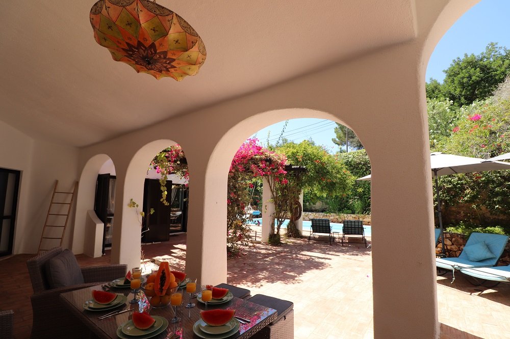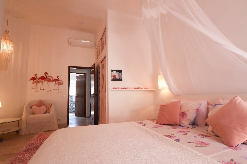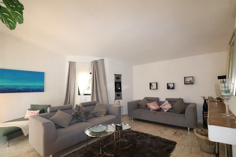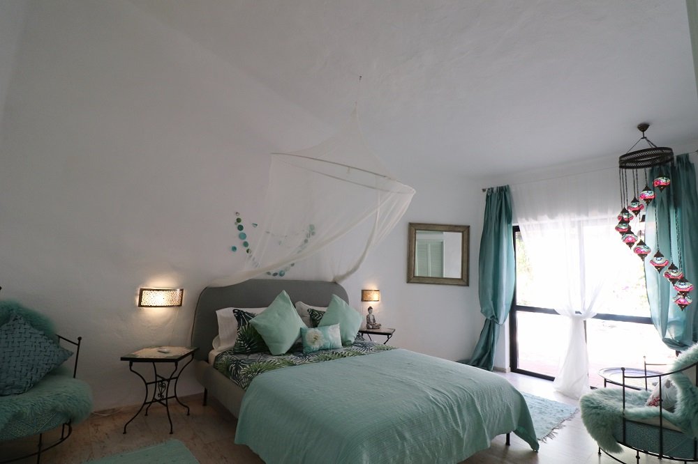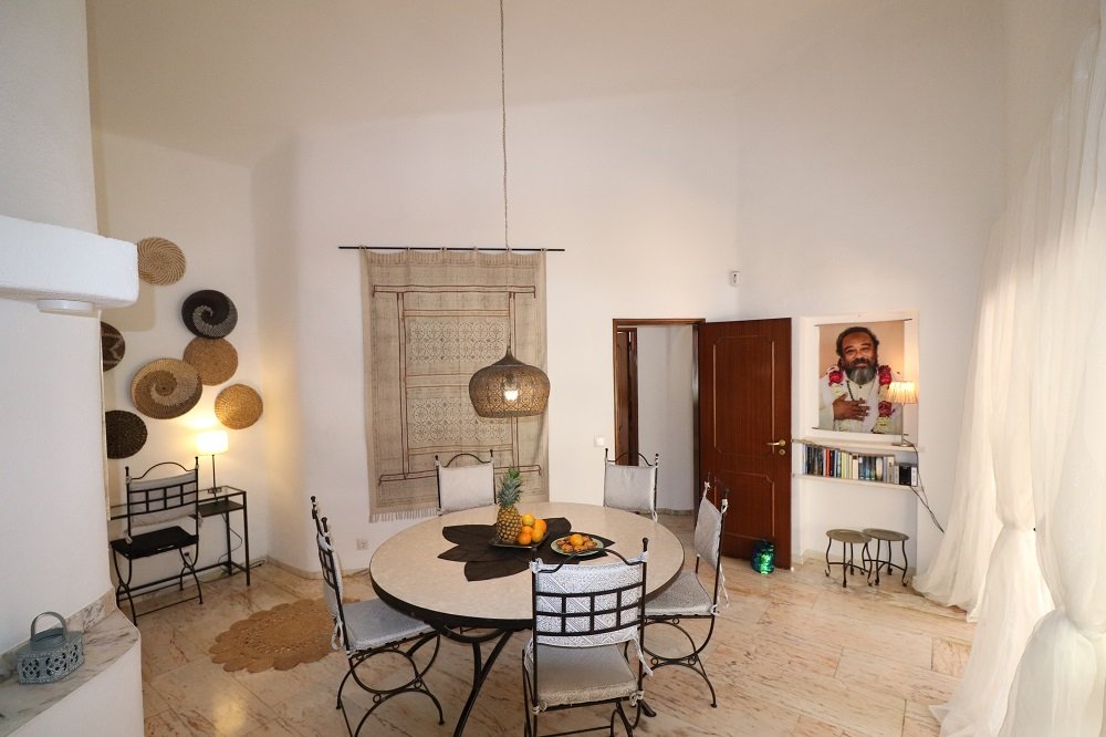Die Villa la Perla wurde im landestypischen maurischen Stil erbaut und liebevoll renoviert. Daraus entstand diese einzigartige Ferien "Oase", sowohl modern als auch traditionell. Eingangs gibt es eine kuppelartige Halle mit Gäste-WC. Zur linken Seite liegen die drei klimatisierten Schlafzimmer, zwei Bäder mit großer begehbarer Regenwalddusche und die Badewanne für "zwei" zum Genießen. Alle Schlafzimmer haben Terrassenzugänge. 1 Schlafzimmer hat ein neues Boxspringbett Kingsize 01.2020. Zur rechten der Eingangshalle gibt es eine voll ausgestattete im Vintage Stil gehaltene Landhausküche. Gegenüber liegen das marokkanisch eingerichtete Esszimmer und das geräumige Wohnzimmer ein paar Stufen höher mit Kamin, SAT/Smart-TV, DVD und WLAN. Alle Zimmer verfügen über Klimaanlagen/Heizungen. Faszination: Fast keine einzige gerade Wand. Von hieraus gelangen Sie zum überdachten Essbereich, den Terrassen mit Pool/Heilkristallbecken und in den clever designten und windgeschützten Garten. Unterschiedliche Schattenplätze im 2000 qm großen Naturgrundstück, und eine marokkanische Pagode, die vielfältig nutzbar ist als überdachter Essplatz im Freien, oder für Yoga und Meditation. Auch eine wunderschöne Venusblume finden Sie im Garten zum regenerieren.