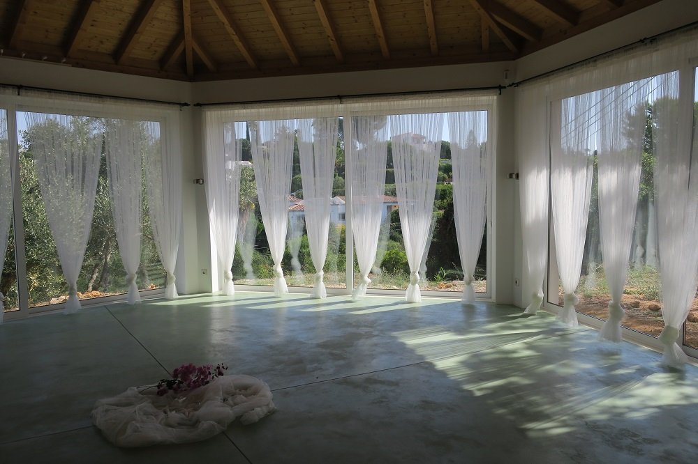 Sechseckiger Seminarraum in Form einer Bienenwabe nach dem Goldenen Schnitt - 60 qm. Bewusst gewählt, weil bekannt ist, dass Menschen sich nachweislich am Wohlsten in einem Sextaeder fühlen. Der Seminarraum kann zu jeder Jahreszeit für[nbsp] Gruppenaktivitäten aller Art genutzt werden. Klimaanlagen und Heizungen sorgen immer für ein angenehmes Klima.