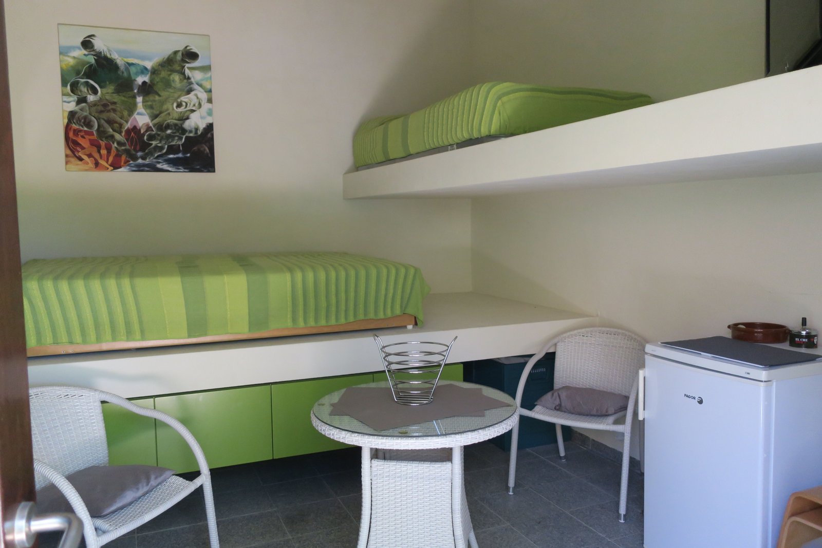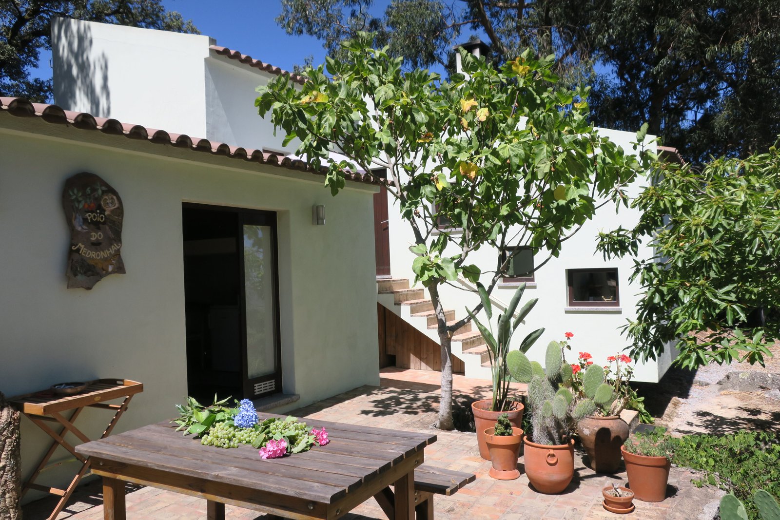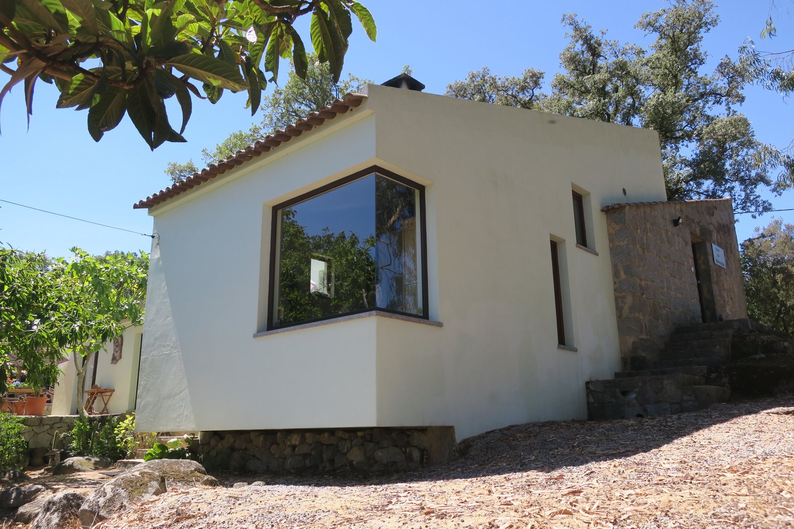 Diese extravagante Casa ist stufenförmig und wunderschön in die Landschaft integriert. Das Haupthaus steht auf einem riesen Felsen und beherbergt, das Wohnzi mit Kamin, dt. Sat-TV, WLAN und Traumblick und die extravagante Küche eine Stufe höher mit dazugehörigem Patio. Das Schlafzi mit Doppelbett und originellem Bad mit Badewanne und Dusche gehören auch dazu. 7 Stufen tiefer ist das kleine Nebenhaus mit einem 2. Schlafzi mit Doppelbett, ein Einzelbett und ein Bad mit Dusche und WC. Die extra Minibar(Kühlschrank), Wasserkocher, DVD, TV und Hi-Fi machen das Nebenhaus perfekt. Neben der Casa ist eine riesige Barbecue-Terrasse, vor der Casa eine tolle Frühstücksterrasse und unten am Pool eine weitere große Terrasse. Durch einen bezaubernden Gang unter großen Bäumen gelangen Sie über die Quelle bis zum ökologischen Pool. Und immer dieses leise plätschern im Ohr – Spa Oase. Vom Pool aus haben Sie einen atemberaubenden Blick über die unbebauten grünen Berge. Schwimmen Sie eine Runde im Pool, trinken Sie das eigene Quellwasser und genießen Sie die Ruhe und Natur. Ökologischer Pool nur mit Salzwasser, da die Wasserqualität hier in Monchique soo gut ist!